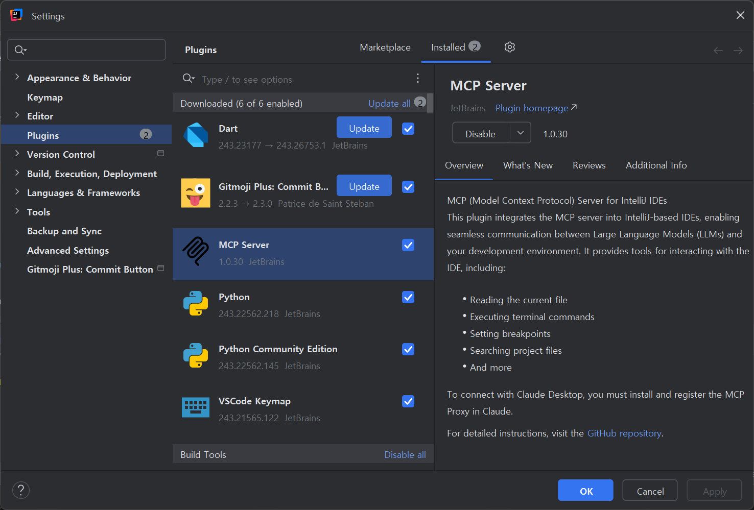 IntelliJ IDE에서 File >> Settings >> Plugins 탭으로 이동하여 MCP Server를 검색하고 설치합니다.