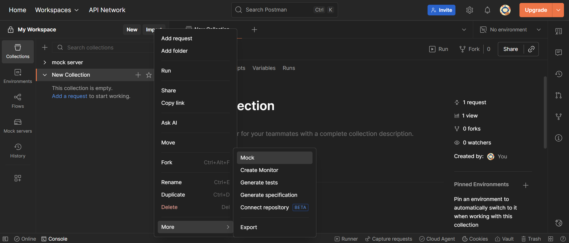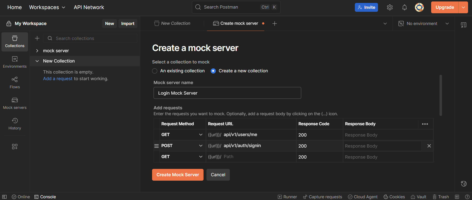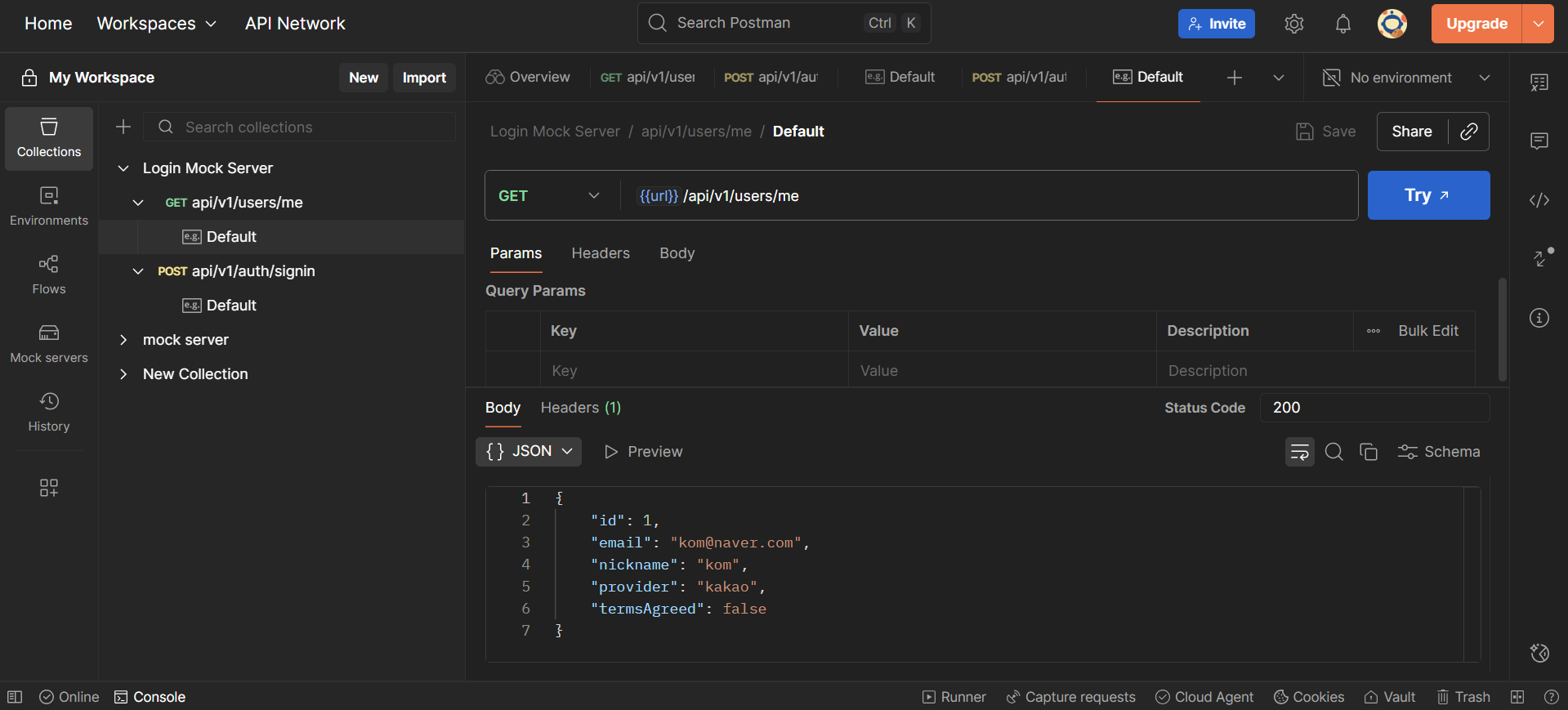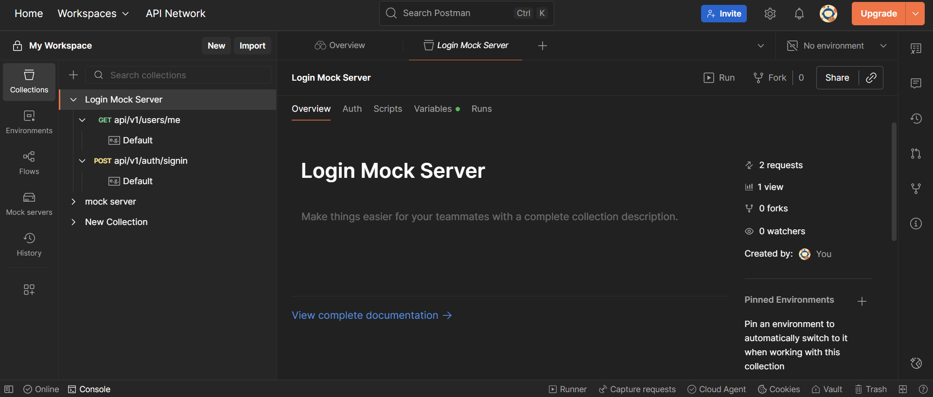 이제 Collections 탭으로 이동하면, 목 서버 생성 시 입력한 엔드포인트가 아래처럼 정의된 것이 보인다. 여기서 자유롭게 추가, 삭제, 수정할 수 있다.